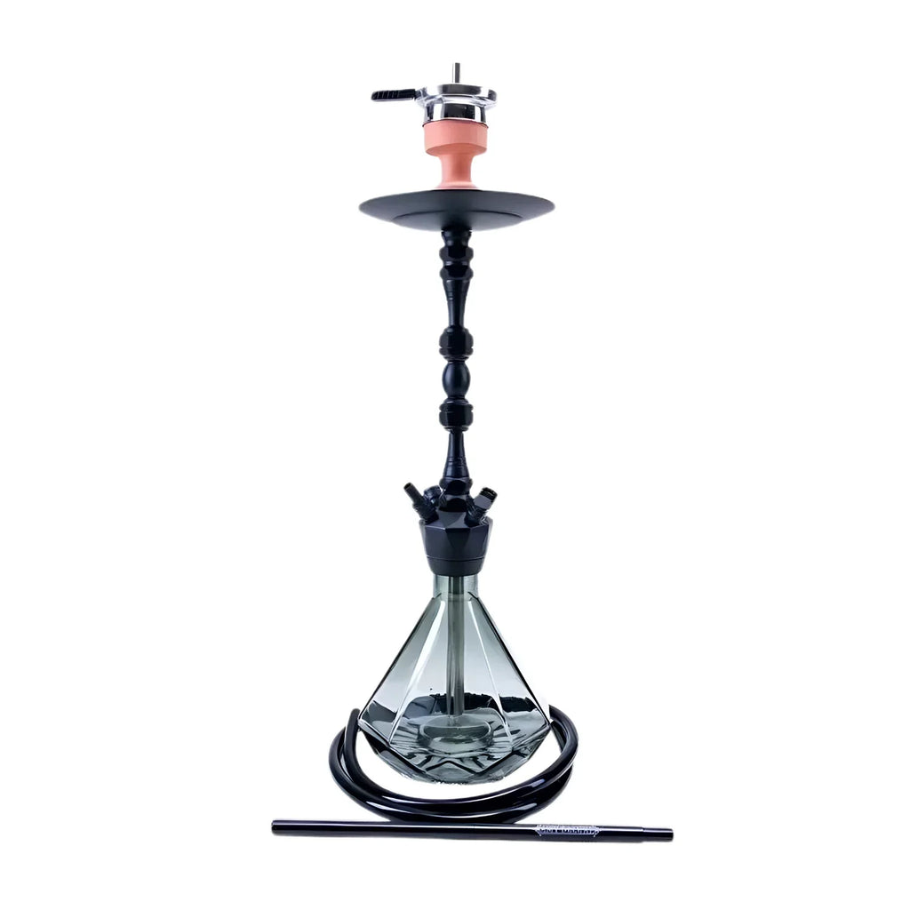 Hookah stem, diamond-shaped glass base, silicone hose with aluminum handle, hot screen set, click system, adjustable diffuser.